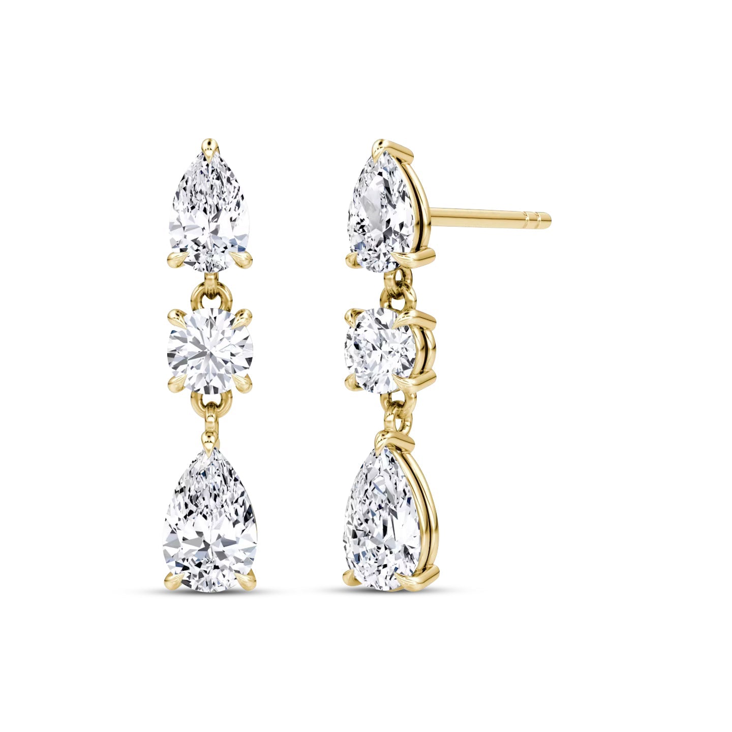 Discover the sophistication of Lyanna Earrings. Featuring three stones, including two pear-shaped ones, this design is intricate and stunning, making it an ideal selection.