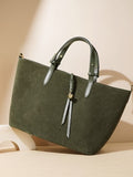 Indulge in luxury with our Suede Tote Bag in Sage Green. Made from premium suede, this bag is both sophisticated and practical. Its spacious interior and sturdy straps make it the perfect accessory for any occasion. Upgrade your style with this exclusive addition to your collection.